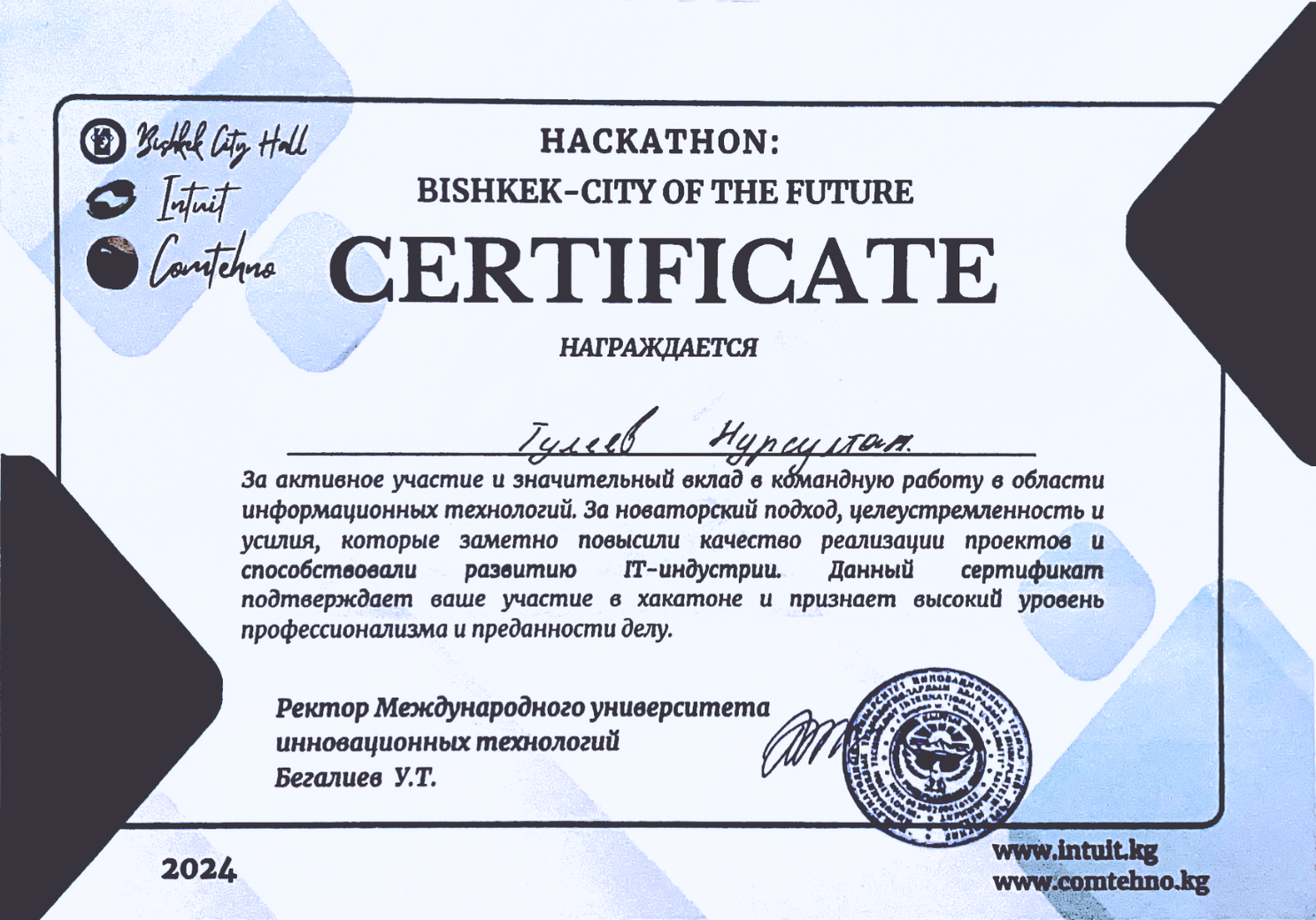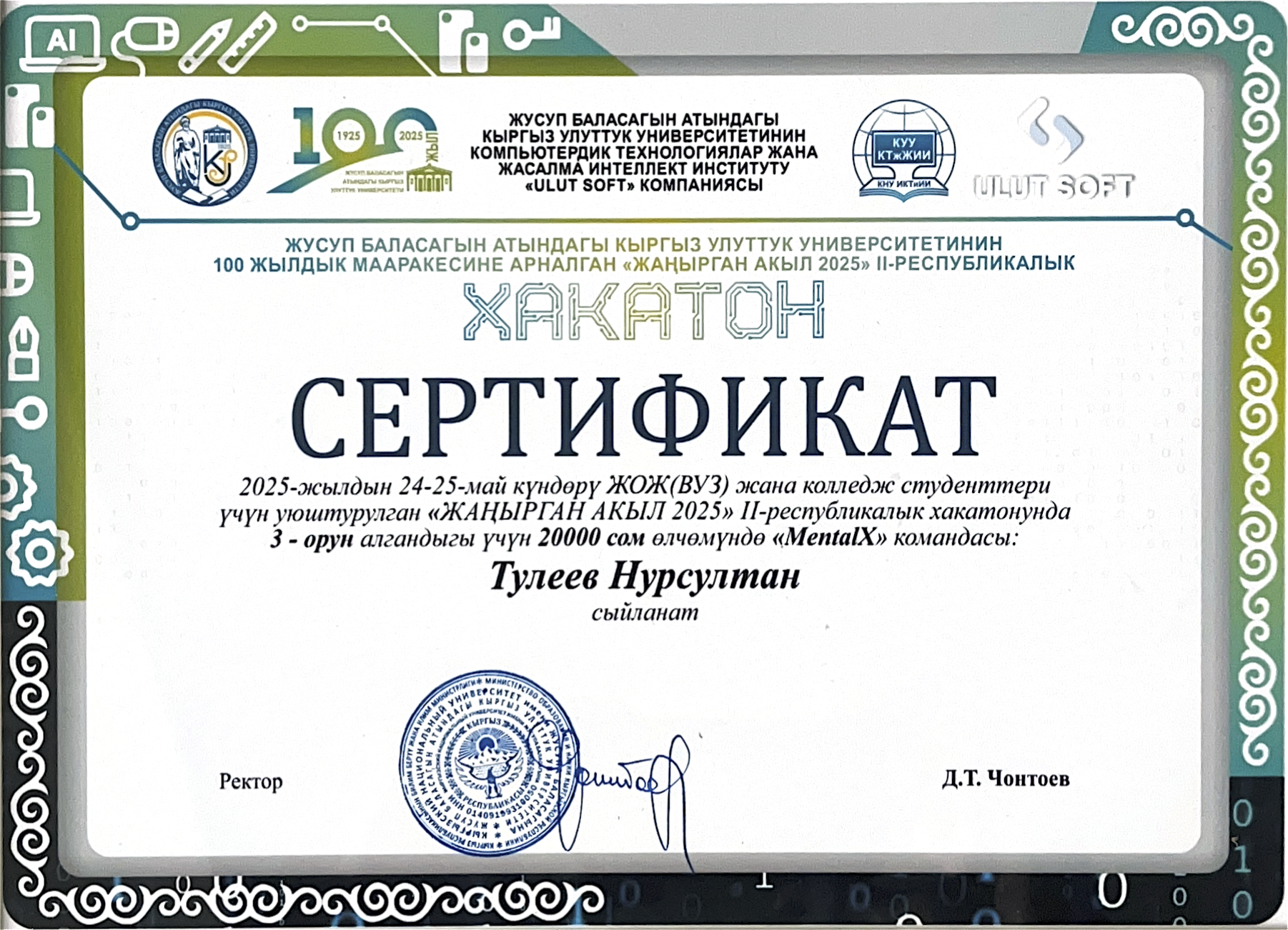 Here are a few technologies I've been working with recently:MentalX is a multilingual mental health platform designed to provide accessible psychological support through a combination of AI, self-guided tools, and professional consultation. It offers users AI-powered emotional guidance, daily affirmations, self-assessment tests, and the ability to book sessions with licensed psychologists — all in Kyrgyz, Russian, and English. Built with a focus on inclusivity and local impact, MentalX was developed as an official partner of the NGO “SOS Children’s Villages”.